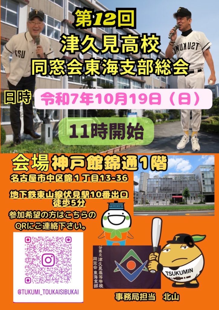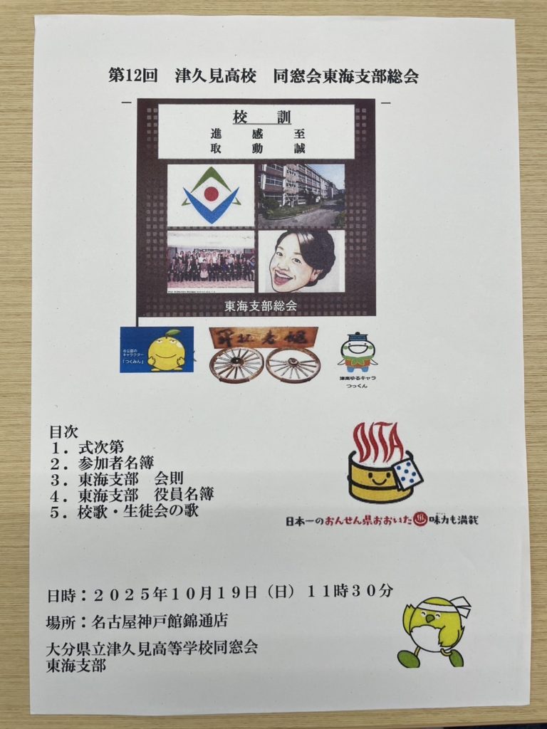 2025/09/16「津久見高校同窓会東海支部総会」開催のお知らせ 2025.09.162025.11.04 東海支部同窓会」が資料の日程で開催されます。多くの同窓生の参加を心よりお待ちしております。 また、東海地区在住の知り合いの同窓生がおられましたら、発信•周知し、参加を勧めていただければ幸いです。 よろしくお願いします。