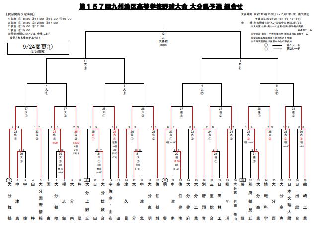 2025/09/27 硬式野球部 初戦快勝 2025.09.272025.11.06 春の選抜大会につながる九州大会大分県予選が開催されています。9月26日(金)に初登場した母校は、対大分高校戦において、9-3で快勝しました。これからも皆さんで応援しましょう。 1 2 3 4 5 6 7 8 9 計 津久見 3 0 1 0 0 4 0 0 1 9 大 分 1 0 1 0 1 0 0 0 0 3 (別紙、トーナメント表は大分県高野連のHPより引用) ▼トーナメントの詳細をご覧になりたい方は、こちらのPDFをダウンロードし、拡大してください。小さな文字も鮮明に見えます。 九州大会県予選ダウンロード