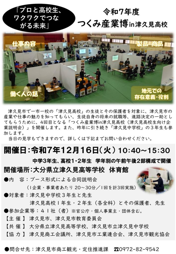 津久見市と津久見高校とがコラボした「つくみ産業博in津久見高校」が開催されます。